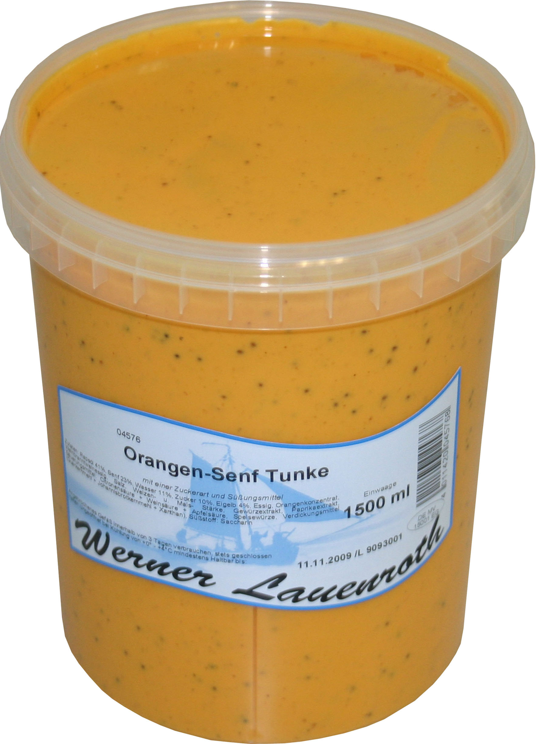 Rapsöl 40%, Wasser 24%, Zucker 14%, Eigelb 4%, Invertzuckersirup 4%, Senfsaat 4%, Branntweinessig 3%, Dextrose 2%, Salz, natürl. Orangenaroma 0.2%, Weizenstärke, modifizierte Stärke, Gewüzextrakt, Farbstoff: Paprika-Extrakt; Säuerungsmittel: Citronensäure, L(+)-Weinsäure, Äpfelsäure; Speisewürze, Stabilisatoren: Guarkernmehl, Xanthan, Johannisbrotkernmehl ...und handwerkliches Können.